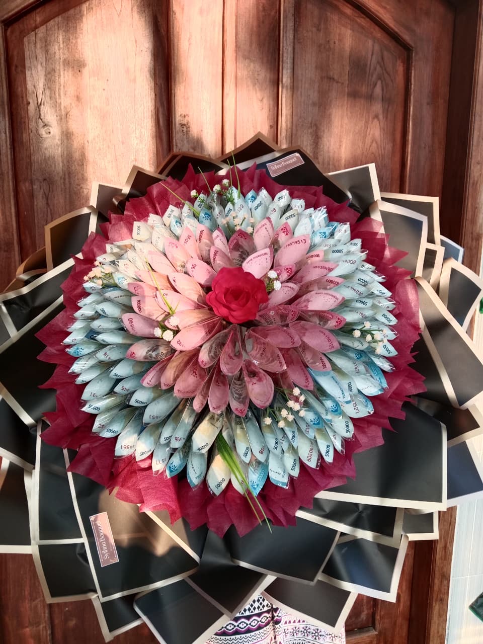 Kado praktis dan elegan: uang digulung atau dilipat rapi diantara bunga dan aksen dekoratif. Pilihan ideal untuk wisuda, ulang tahun, dan hantaran lamaran.